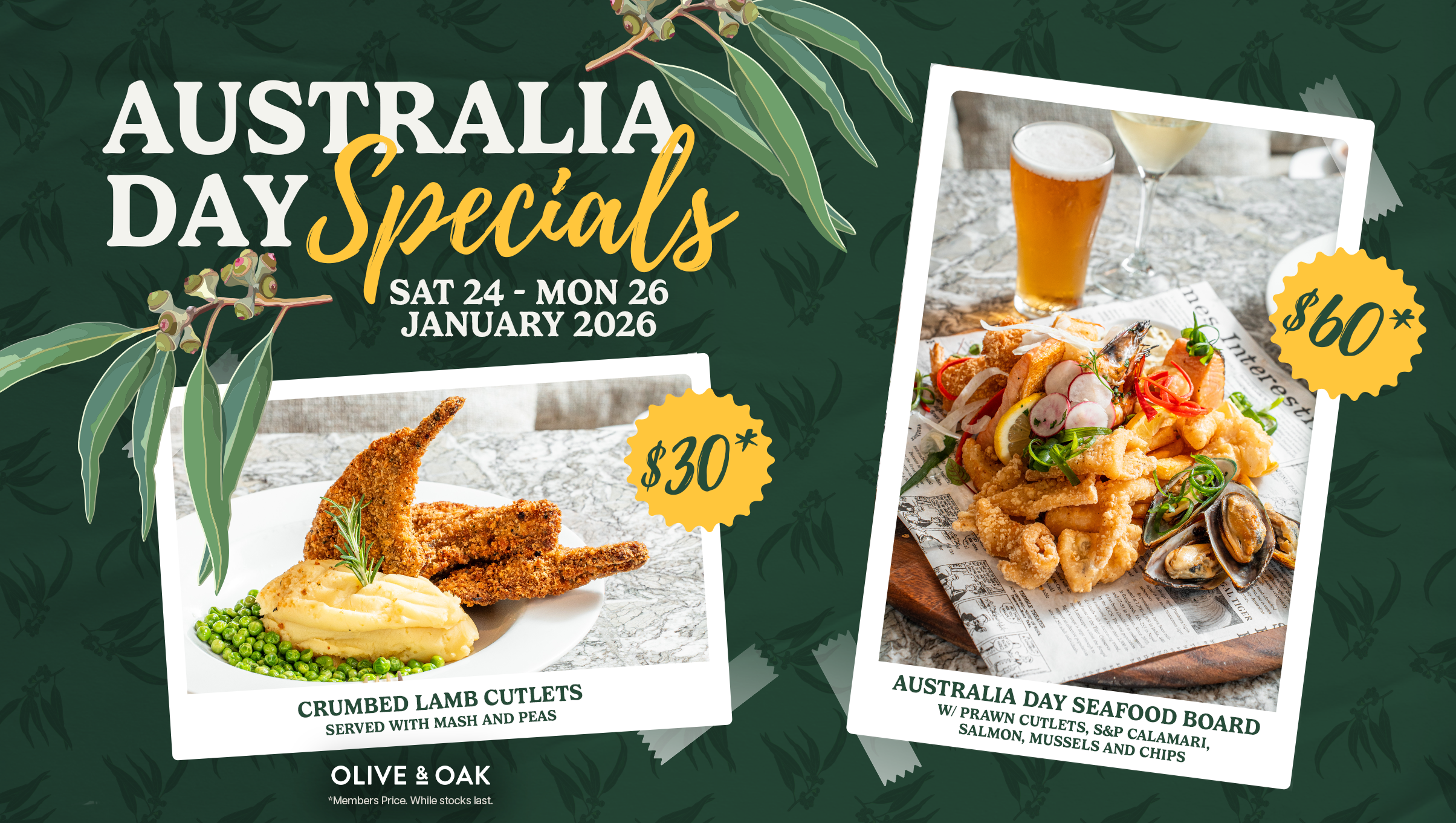 Join us at Olive & Oak over the long weekend for our Australia Day specials! Crumbed Lamb Cutlets served w/ chips and salad - ...