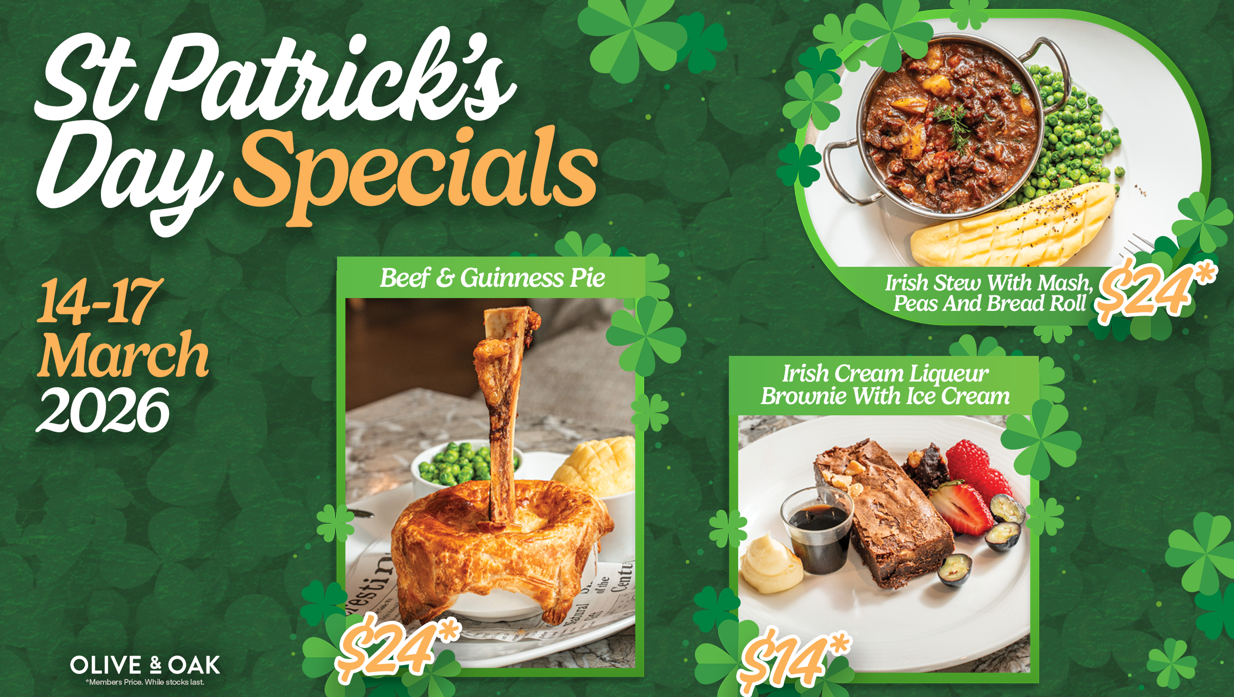 Get into the St Patrick’s Day spirit with our specials at Olive & Oak from 14-17 March! Beef & Guinness Pie – $24* Iri...