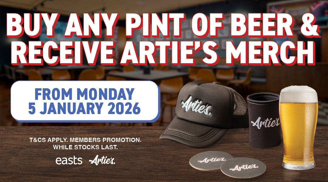 From Monday 5 January 2026, buy any pint of beer and receive FREE Artie's merch. Members Promotion. T&Cs apply.