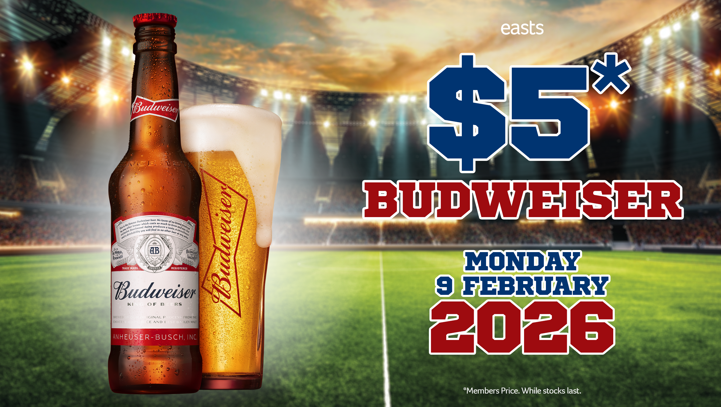 Cheers to the Super Bowl 2026! $5* Budweisers available Monday 9 February. *Members Price. While stocks last.